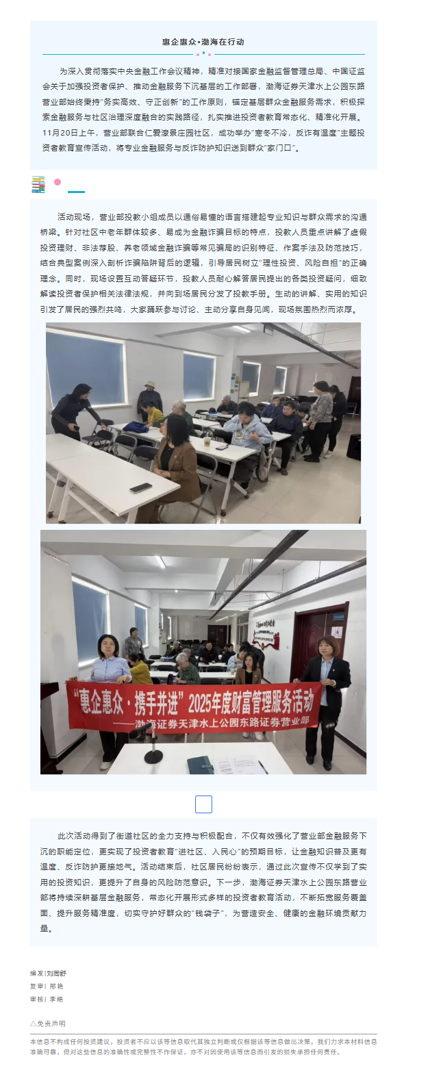 【惠企惠众·渤海在行动】渤海证券天津水上公园东路证券营业部走进仁爱濠景社区