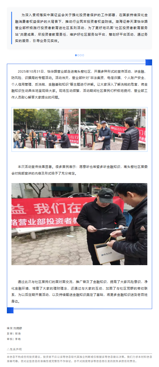 【惠企惠众·渤海在行动】渤海证券天津怡华路营业部走进南头窑社区